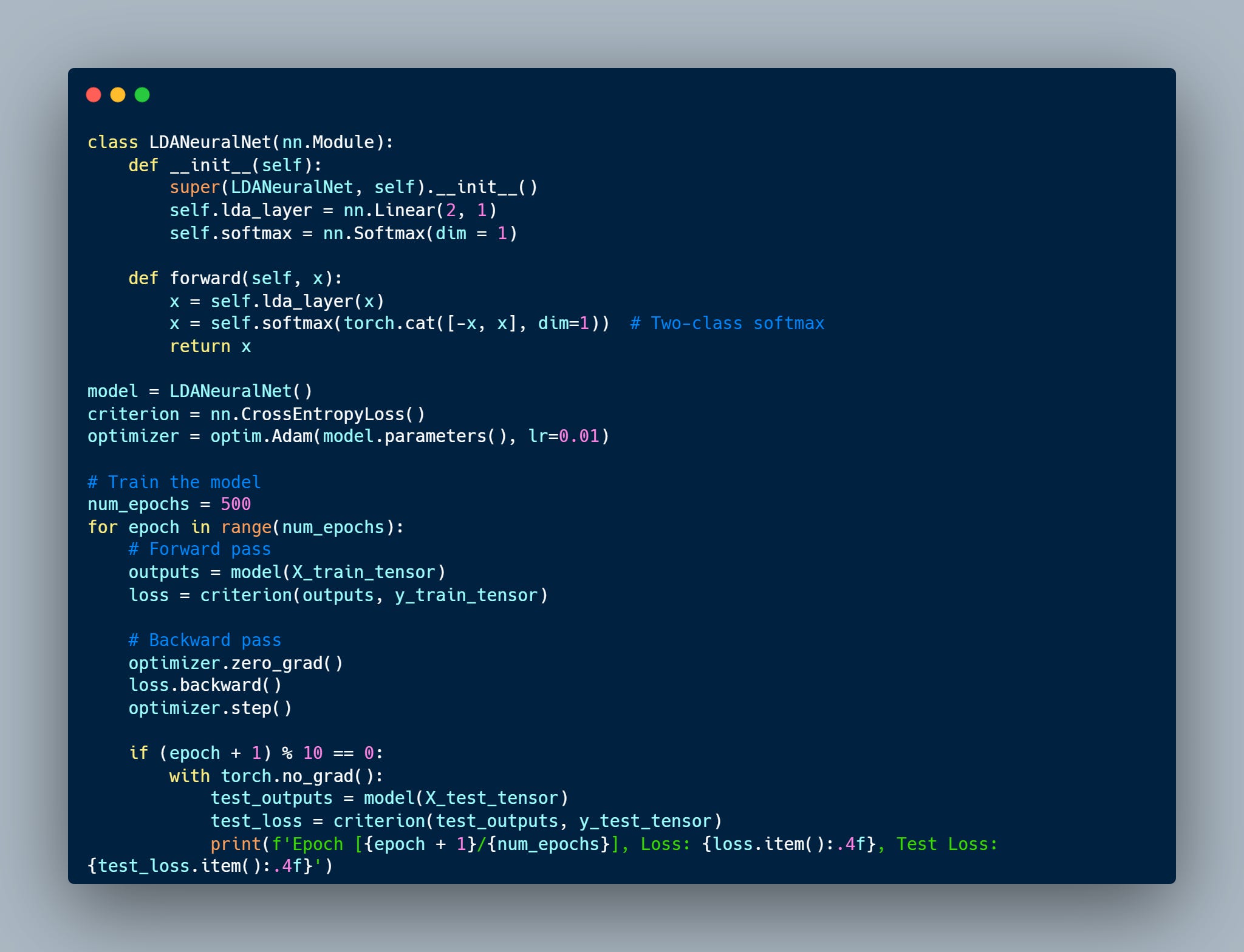 Training objective: Minimize cross-entropy loss, which is the same as maximizing class separability. Unlike LDA which computes a closed-form solution, the neural network can be trained using gradient-based optimizers.
