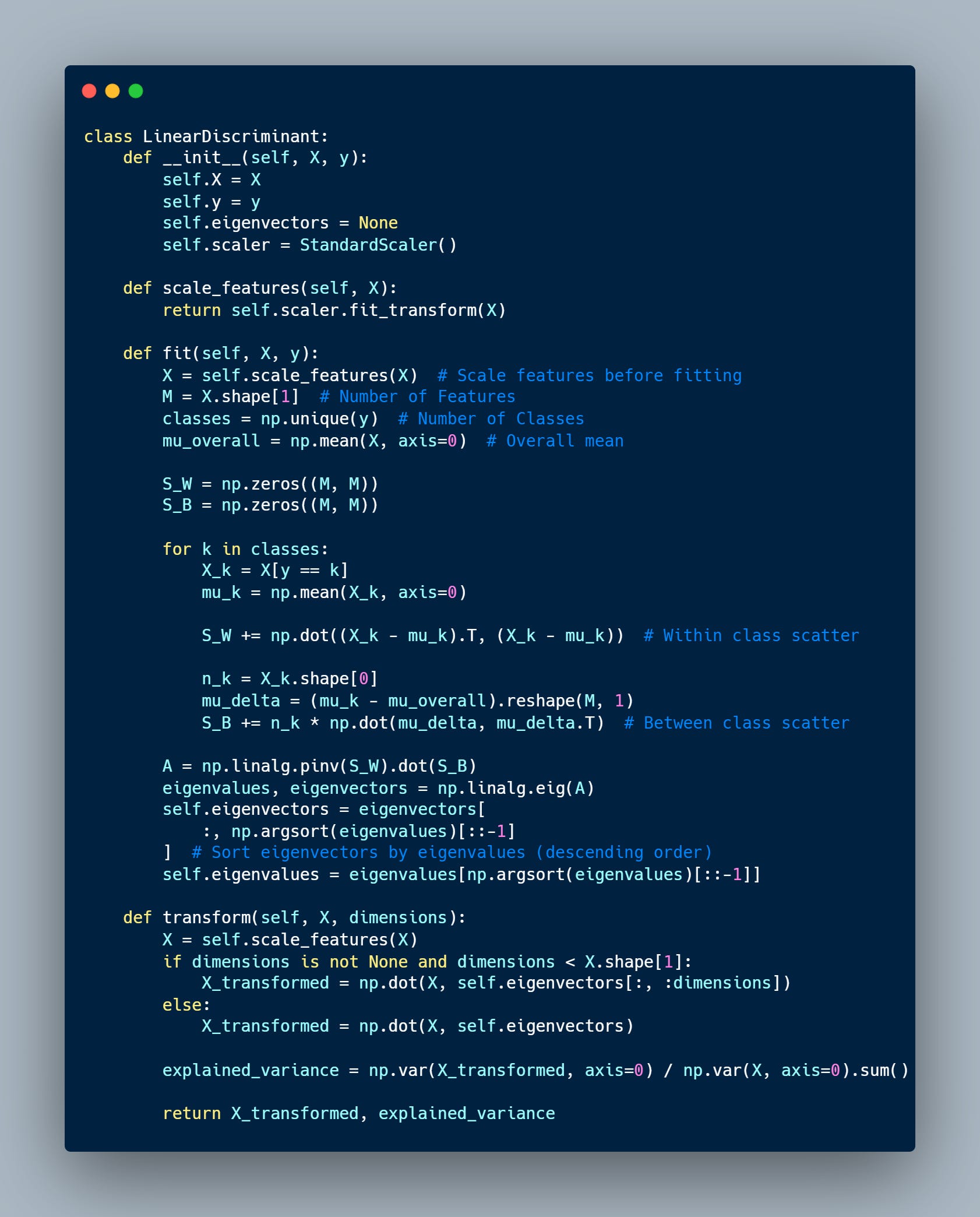 The below equation represents the discriminant's function for class k. The formula encapsulates the essence of LDA's classification mechanism, combining priors of the equation, covariance information, and distance of a data point from the class mean. By evaluating this function for each class and selecting the class with the highest score, LDA makes the classification decision. This below equation is after logarithm of f(x) since log is montonic and preserves the order of the original equation.